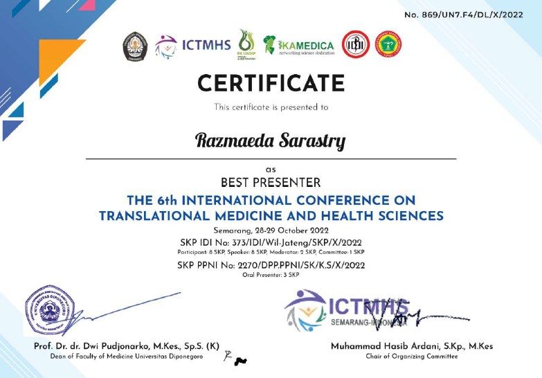 Gelaran The 6th International Conference on Translational Medicine and Health Science membuahkan hasil manis bagi mahasiswa Program Studi Obstetri dan Ginekologi, Razmaeda Sarastri. Atas kecakapannya